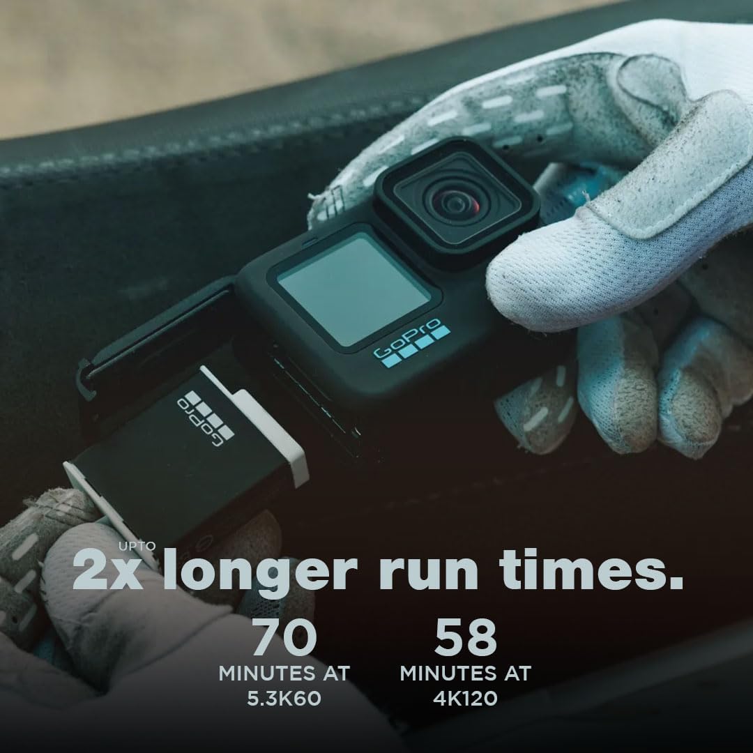 2x Longer Runtime¹ : HERO12 Black’s dramatically improved battery efficiency combines with the included 1720mAh Enduro battery to deliver a huge 2x increase in 5.3K60 video runtime on each charge. You’ll get 70 minutes of continuous recording at 5.3K60 (our highest setting), plus over 1.5 hours at 5.3K30 and over 2.5 hours of continuous recording at 1080p30.6 Using advanced technology, Enduro also boosts performance in cold temperatures over previous GoPro cameras and batteries